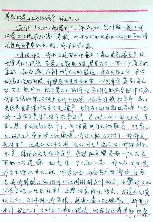 原标题:在泰山乱写乱画,15岁“熊孩子”致歉
