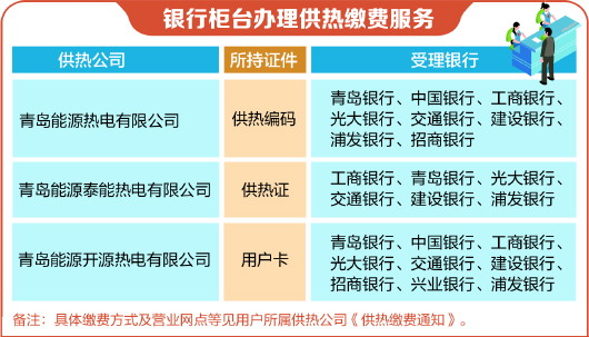 本报9月6日讯 记者从青岛能源集团了解到,临近2019~2020年供热季,青岛能源集团所属供热单位自2019年9月1日~11月16日为广大用户提供供热季的热费缴纳服务,停热或恢复用热业务需在10月16日前办理。用户可通过银行(银行柜台、网上银行、手机银行、银行自助终端)以及“青岛能源集团”微信公众号、支付宝等方式快速办理相关业务。