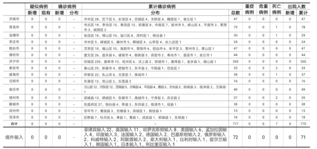 山东无新增本地疑似病例、确诊病例。累计报告确诊病例777例,死亡7例,治愈出院770例。