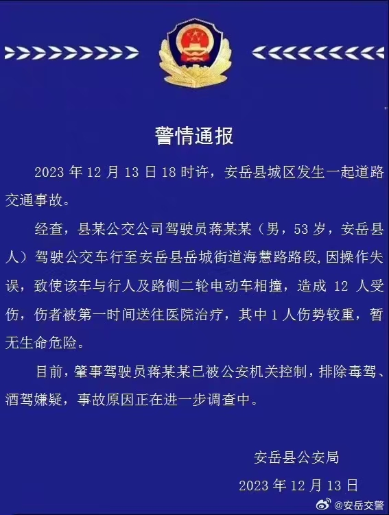 经查,县某公交公司驾驶员蒋某某(男,53岁,安岳县人)驾驶公交车行至安岳县岳城街道海慧路路段,因操作失误,致使该车与行人及路侧二轮电动车相撞,造成12人受伤,伤者被第一时间送往医院治疗,其中1人伤势较重,暂无生命危险。