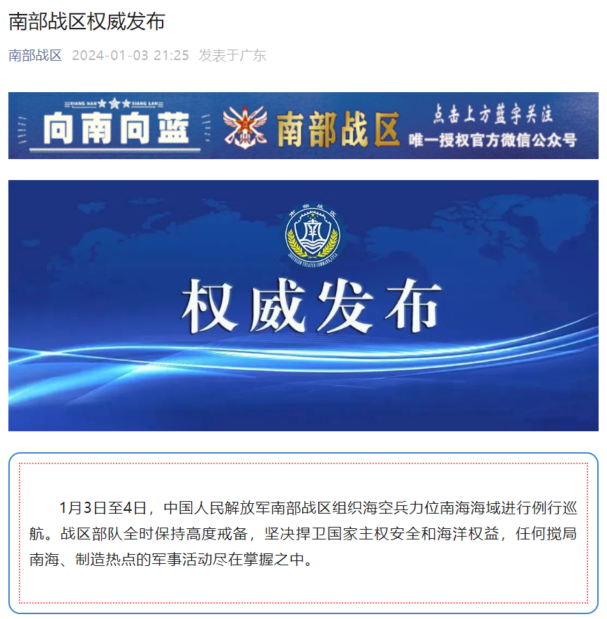 1月3日至4日,中国人民解放军南部战区组织海空兵力位南海海域进行例行巡航。战区部队全时保持高度戒备,坚决捍卫国家主权安全和海洋权益,任何搅局南海、制造热点的军事活动尽在掌握之中。
