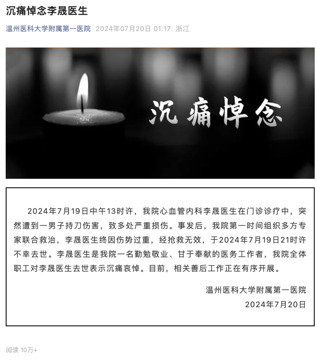 7月20日凌晨,温州医科大学附属第一医院官微发布悼文《沉痛悼念李晟医生》:2024年7月19日中午13时许,我院心血管内科李晟医生在门诊诊疗中,突然遭到一男子持刀伤害,致多处严重损伤。事发后,我院第一时间组织多方专家联合救治,李晟医生终因伤势过重,经抢救无效,于2024年7月19日21时许不幸去世。