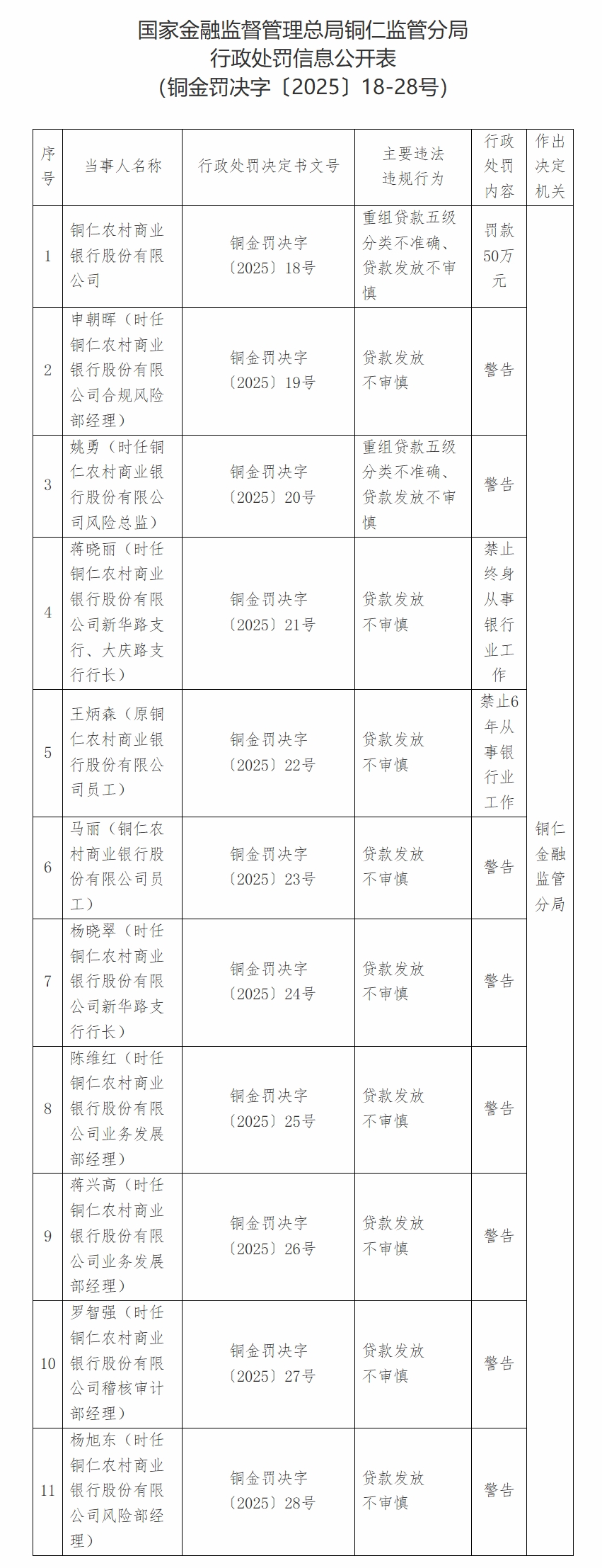 行政处罚决定书显示,铜仁农村商业银行股份有限公司存在重组贷款五级分类不准确、贷款发放不审慎的违法违规行为,铜仁金融监管分局对铜仁农商行处以50万元罚款,并对多名责任人作出行政处罚。其中,时任铜仁农村商业银行股份有限公司新华路支行、大庆路支行行长蒋晓丽对贷款发放不审慎负有责任,被禁止终身从事银行业工作;原铜仁农村商业银行股份有限公司员工王炳森对贷款发放不审慎负有责任,被禁止6年从事银行业工作;其他8名相关责任人被警告。