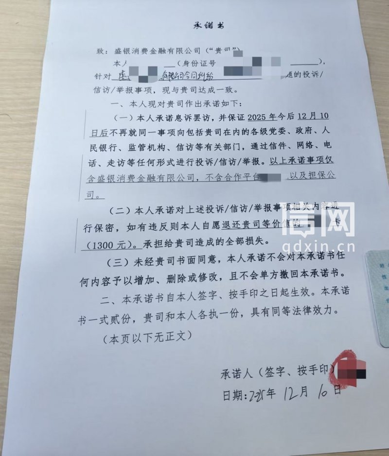 信网/信号新闻12月18日讯 日前,信号新闻(0532-80889431)报道了浙江的黄先生在进行网贷时,遇到了不知情的担保类费用及借款前关键信息空白一事(详见《宁银消费放的网贷用空白合同虚增一堆服务费 究竟谁收的成谜》)。12月3日,黄先生联系了其中2笔借款的放款方盛银消费金融有限公司(以下简称“盛银消费”)反映空白合同情况。盛银消费表示,只要黄先生签署《息诉罢访承诺书》,就可以以网上商城储值消费卡的形式,退还其所收取的利息。但黄先生在承诺书中补充了一些内容后,盛银消费却将退还的金额打了折扣。