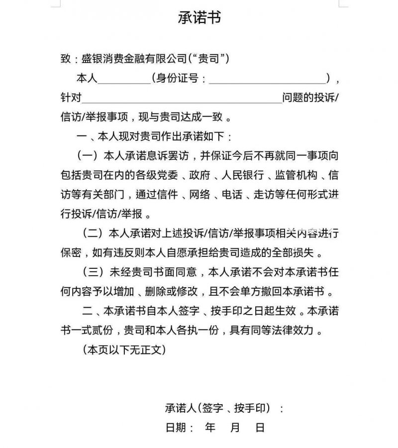 盛银消费发送给黄先生的承诺书模板(来源:受访者)
