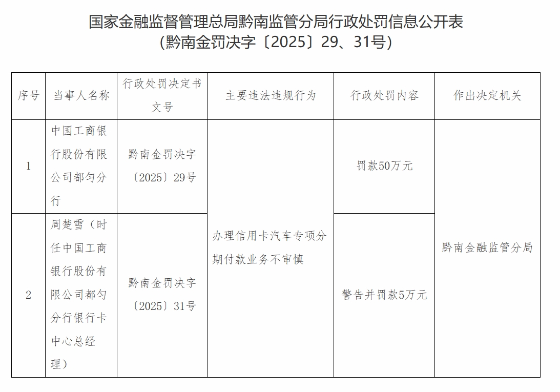 违规办理信用卡汽车分期业务 工商银行都匀分行被罚50万