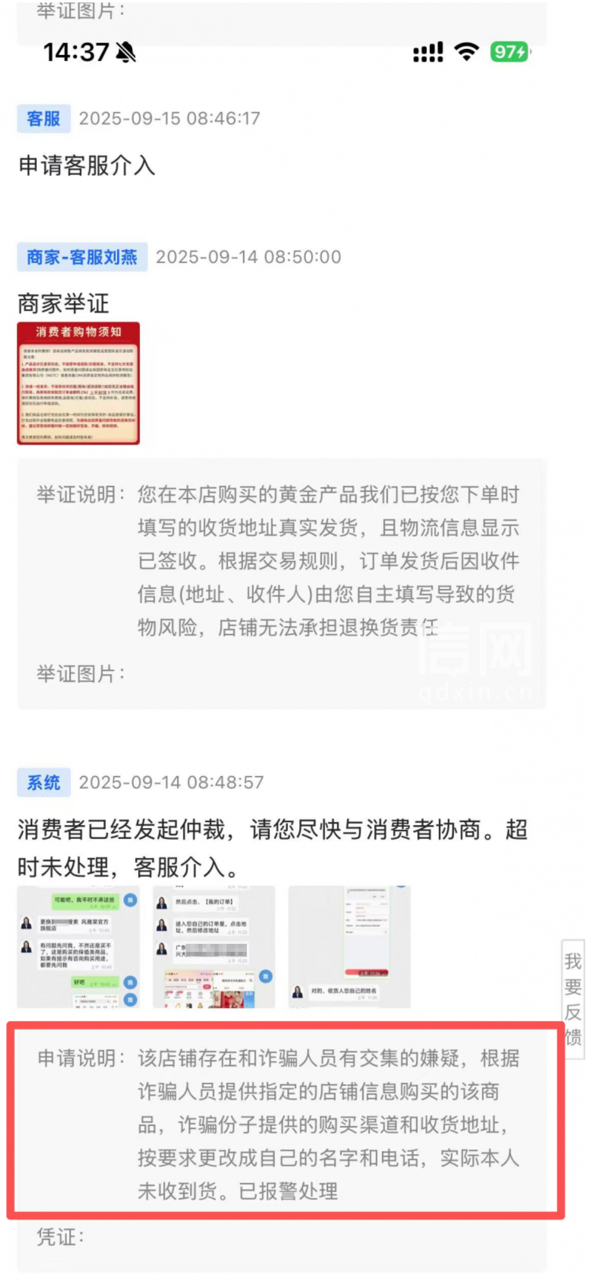 9月14日,陈先生突然收到平台后台的售后申请。四天前下单购买金条的消费者,以“遭遇网络诈骗,没有收到商品”为由向平台发起申请,要求仅退款。