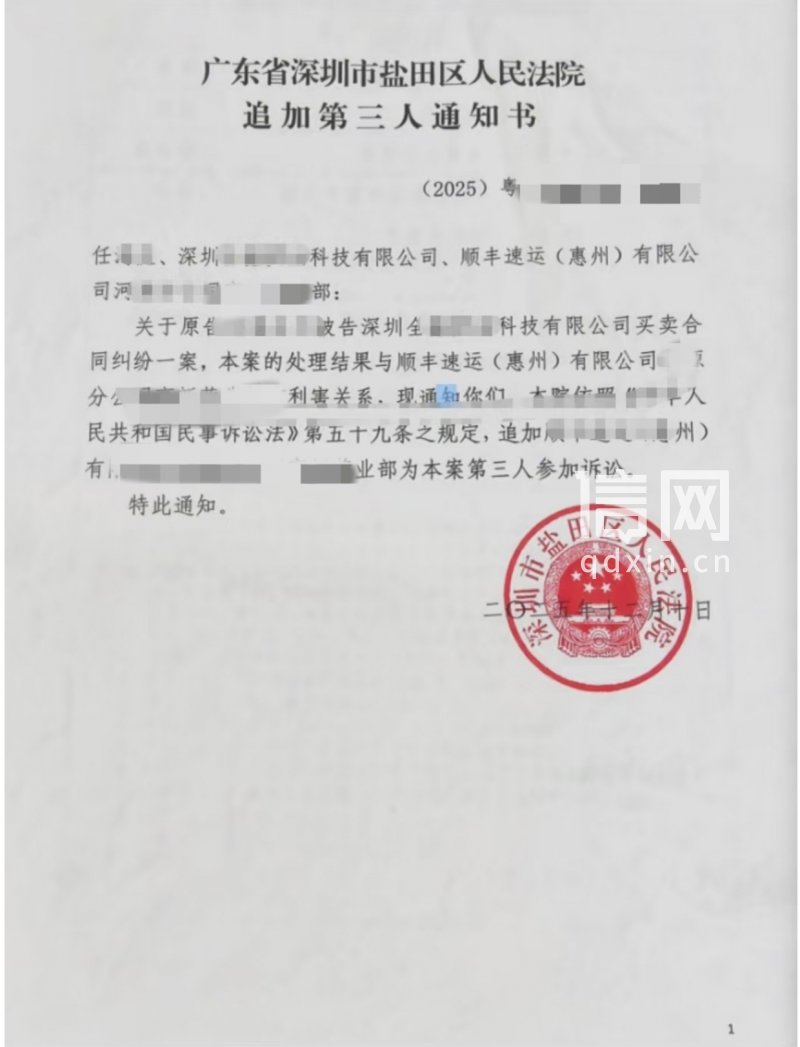 而在平台和商家看来,这位消费者的售后理由并不成立。也正是因为仅退款的要求没有被支持,这位消费者将陈先生经营的公司起诉。12月10日,深圳市盐田区人民法院追加了负责派送这一快递的顺丰速运(惠州)有限公司河源分公司高新营业部为本案第三人参加诉讼。
