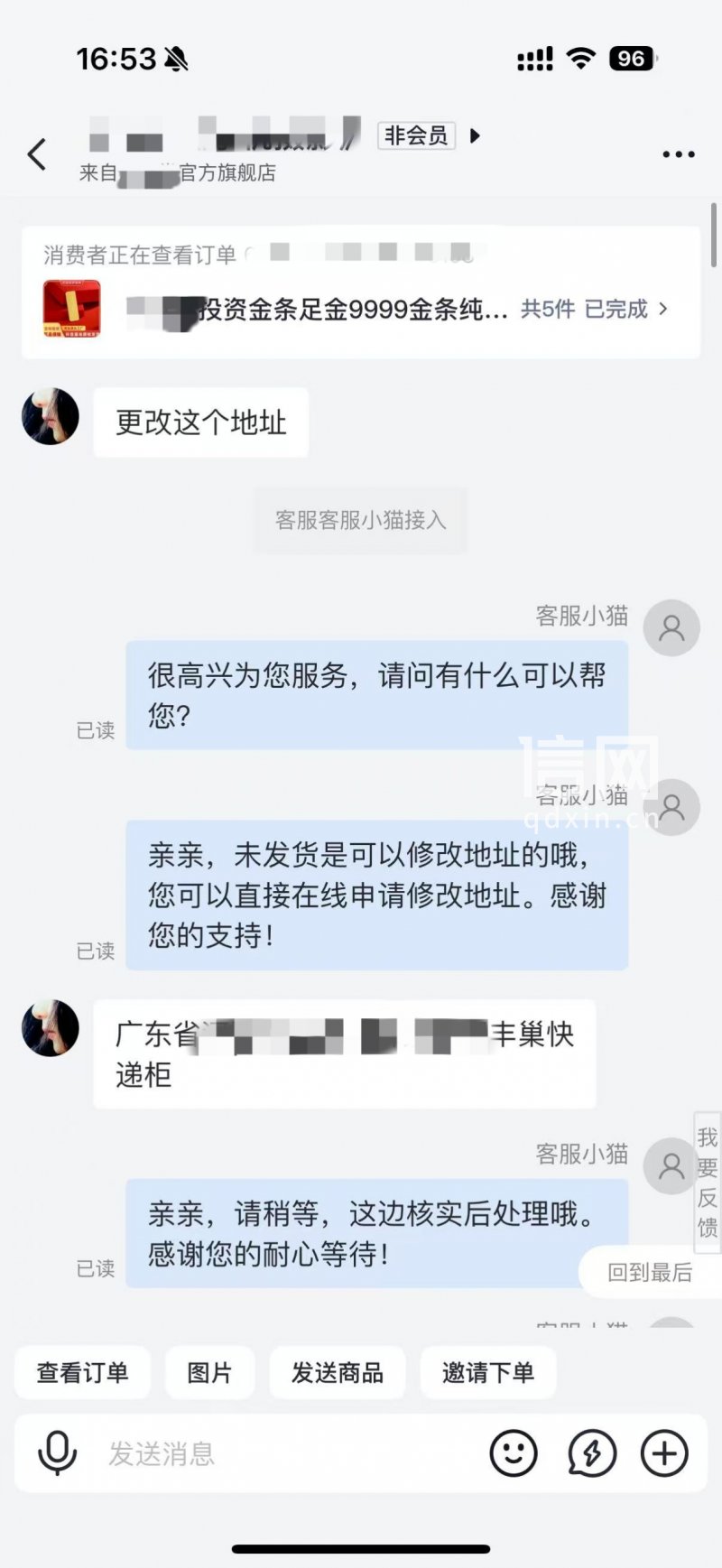 据陈先生回忆,9月10日10点51分,有消费者在自己的电商平台店铺下单购买了5根规格为10克的9999足金投资金条,实付42250元。下单6分钟后,消费者联系客服,要求将原先在陕西的收货地址修改为广东省河源市一小区的丰巢快递柜。