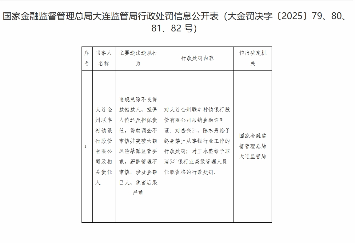 国家金融监督管理总局大连监管局对大连金州联丰村镇银行股份有限公司处以吊销金融许可证的处罚。同时,对相关责任人岳兴江、陈志丹给予终身禁止从事银行业工作的处罚,对王永盛取消5年银行业高级管理人员任职资格的处罚。(信网记者)