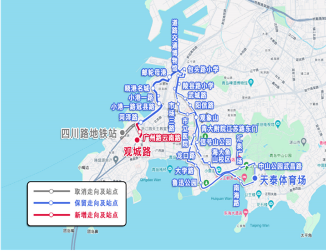 主站由四川路地铁站变更为观城路,副站为天泰体育场,调整后为:观城路—天泰体育场。