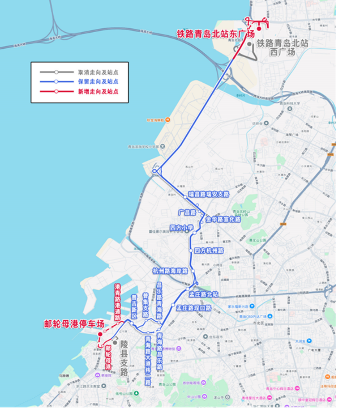 主站由铁路青岛北站西广场变更为铁路青岛北站东广场,副站由陵县支路变更为邮轮母港停车场,调整后为:铁路青岛北站东广场—邮轮母港停车场。