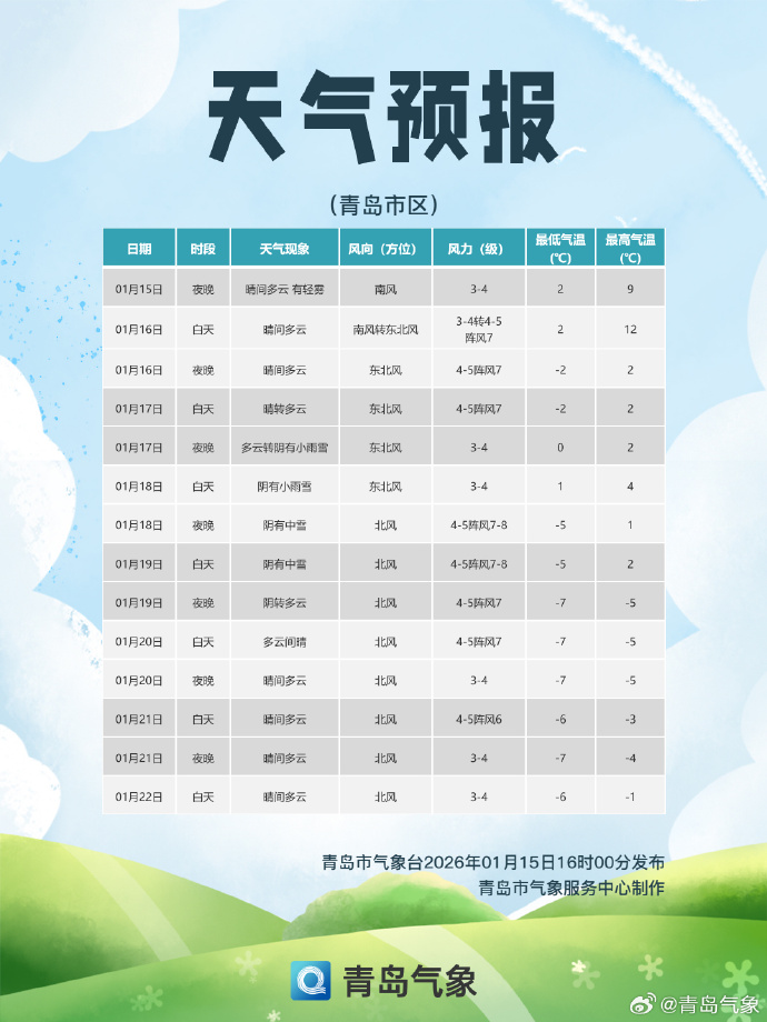 1月16日白天,青岛市持续晴朗天气,全市最高气温在10~14度。随着新一轮冷空气的到来,下午风向转为北风后,风力增大。1月17日(周六),青岛转为多云天,北风持续偏大,冷空气带来的降温威力显现,各区市的最高气温会迅速回落到2度左右。而到了18日(周日),青岛天气更为复杂,将会出现雨雪过程。