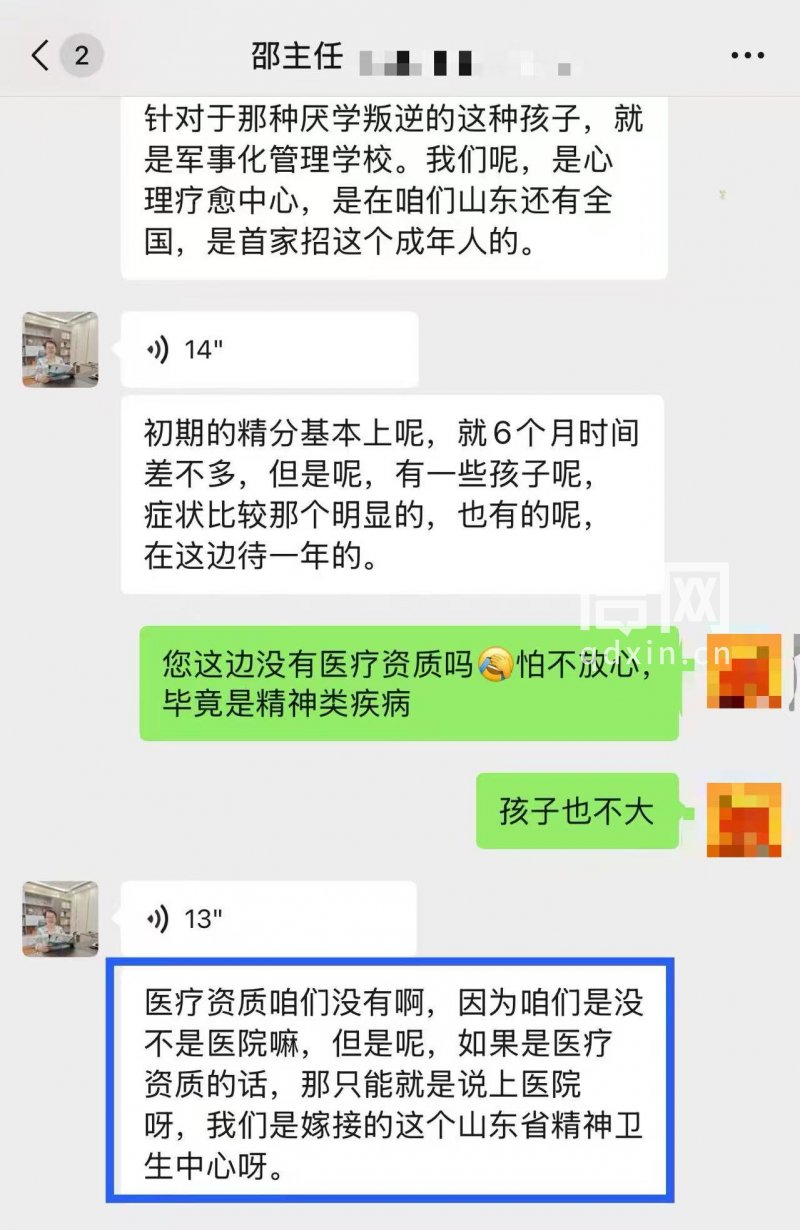 张女士的老家在河南开封,家里有个患有精神分裂症的弟弟。张女士介绍说:“弟弟今年30岁,确诊这个病有八九年,平日靠服药控制,需家人提醒用药。可现在,弟弟被送去了济南的一个拓展中心,接受所谓的‘封闭疗愈’,我很担心他。”