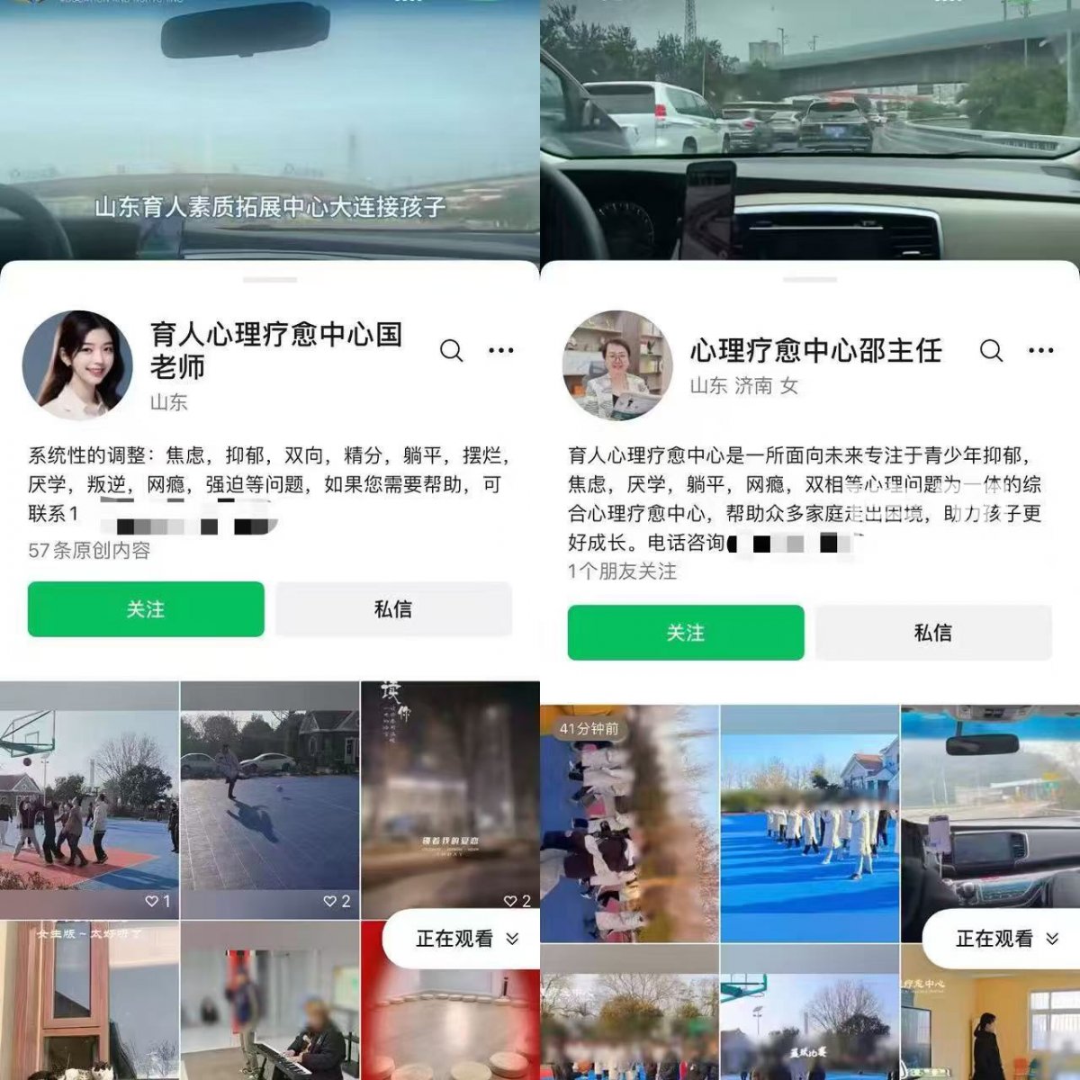 此外,信号新闻在微信视频号上搜索到多个与这一机构相关的账号,内容都与“接孩子”“疗愈”有关。但这些账号都是以个人名义注册,其中一个写着“系统性的(地)调整焦虑,抑郁、双向、精分……”并附了联系电话与微信号。