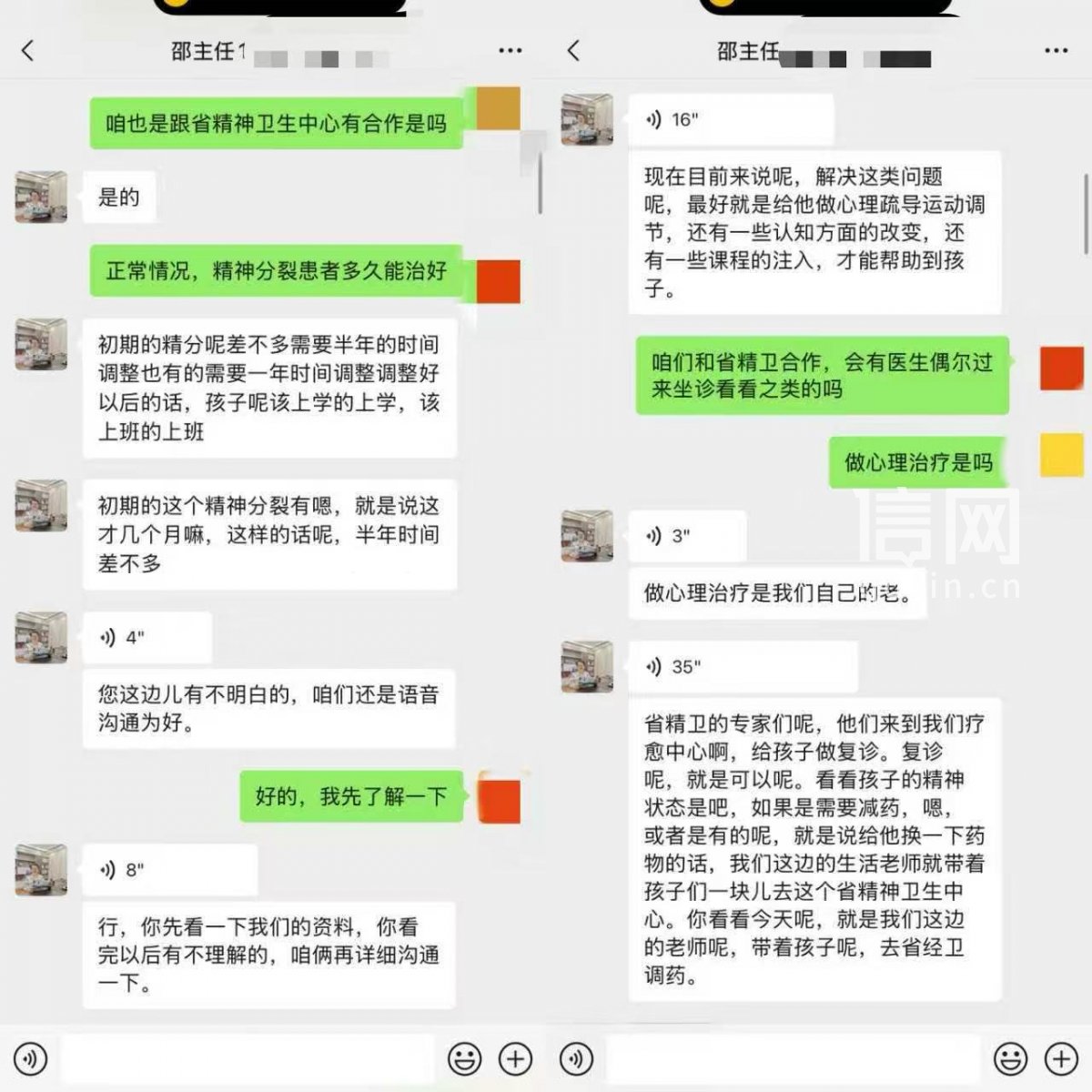信号新闻以患者家属身份,联系上育人心理疗愈中心负责招生的邵女士。她声称机构的服务范围不仅包括厌学、抑郁、焦虑、网瘾等问题,还明确接收双相情感障碍、精神分裂症患者。邵女士介绍说:“初期精神分裂症患者好调整,至少需要半年全托封闭疗愈。”
