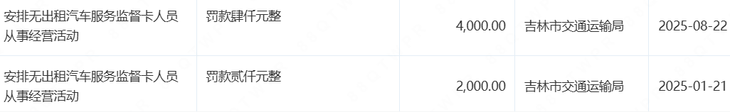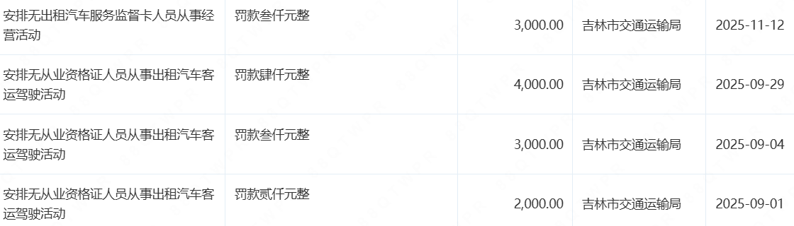 2025年以来,该公司多次因安排无出租汽车服务监督卡或无从业资格证人员从事经营活动,被吉林市交通运输局处罚。(信网记者)