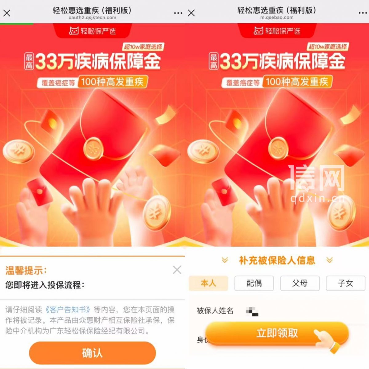等到捐款支付成功后,页面自动跳转至“轻松保严选”界面,上方显示“最高33万疾病保障金,覆盖癌症等100种高发疾病”,下方为被保险人信息补充栏,姓名与身份证号已自动填入,对应产品为“轻松惠选重疾(福利版)”。页面显示,该产品由众惠财产相互保险社承保,保险中介机构为广东轻松保保险经纪有限公司。