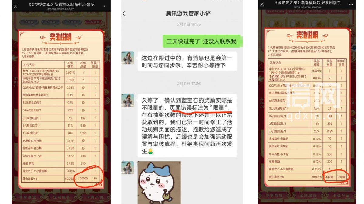 面对多出来的“蓝色宝石”,王先生联系了游戏客服进行投诉。等待数日后,他收到了回复。“腾讯游戏管家小铲”表示,奖励标注出现了错误:“确认到蓝色宝石的奖励实际是不限量的,页面错误标注为‘限量’,在有抽奖次数的情况下还是可以正常获取到的,我们已第一时间修正了活动规则页面的描述。”此时,王先生再次查看游戏的奖励页面,发现“蓝色宝石”的数量确实已经由“单用户限量30次”变成了“不限量”。