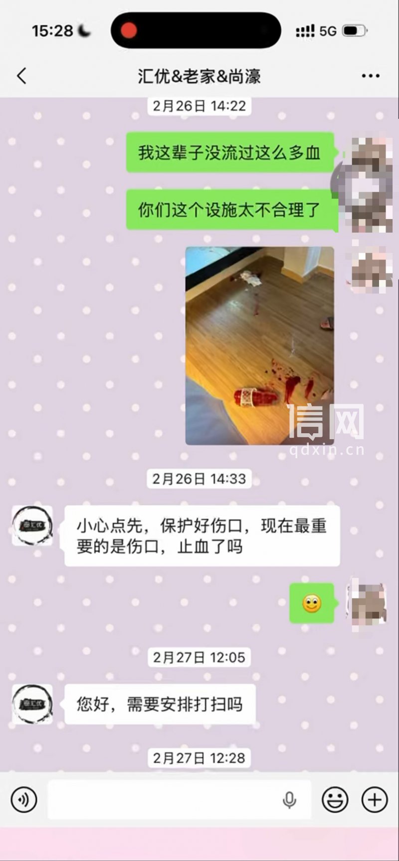 许女士表示,受伤后她将情况告知汇优民宿,从其提供的聊天记录可见,对方仅简单询问伤口是否止血,其余沟通多为清扫房间、提醒退房时间等事宜。因受伤影响正常活动,原定旅游行程被迫打乱,也不便更换住宿,许女士直至28日才退房离开。她认为,民宿设施存在安全隐患导致自己受伤,理应退还全部房费,但该要求遭到拒绝,汇优民宿仅同意报销30元医疗费用。