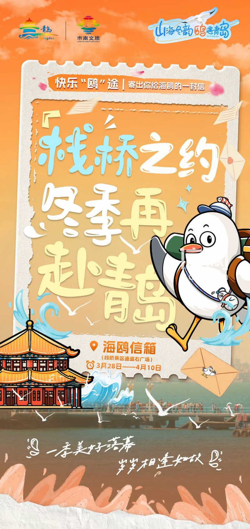 活动现场亮点纷呈,栈桥景区上线“海鸥信箱”,市民可写下寄语投递,孩童的暖心话语将收录进《海鸥寄语纪念册》,暖心“鸥”语征文活动也同步开展;少年们将开展护鸥公益行动,清理海岸杂物、观测海鸥动向,14:30起还将上演春迁主题歌会,孩子们将诵读写给海鸥的期许。此外,12周岁以下儿童可享一分钱体验“海鸥告别季”专属海上航线福利,完成航行可获研学科普证书。