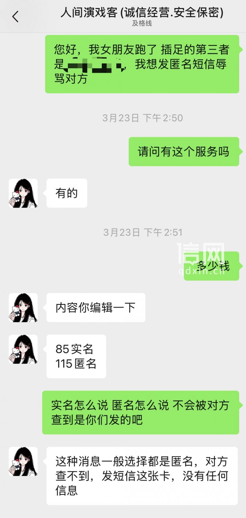 信号新闻随后又以“帮忙骂讨厌的人”为由,咨询了同平台的另一商家,同样被引导添加了认证信息为“安徽及格线信息技术有限公司”的企业微信。对方称,除了辱骂他人、冒充权威身份催收外,该商家还可承接向单位领导举报他人生活作风问题或工作失职、代发广告骚扰等业务。“只要你把内容和对方信息给我们,我们就能按要求发送,保证不留痕迹。发短信这张卡没有任何信息,对方查不到,115元一条。”