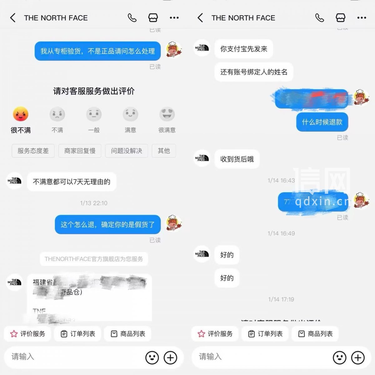信网·信号新闻4月9日讯 近日,江苏的王女士向信号新闻(0532-80889431)反映,1月3日她在电商平台的“THE NORTH FACE”店铺直播间花1098元买了一件北面羽绒服,结果发现厚度不对,在得物平台鉴定为假货。商家当时答应退货退款,可等王女士把衣服寄回去后,这家店铺竟然注销了,电商平台表示只能尝试打电话催缴退款。王女士陷入了“钱货两空”的境地。
