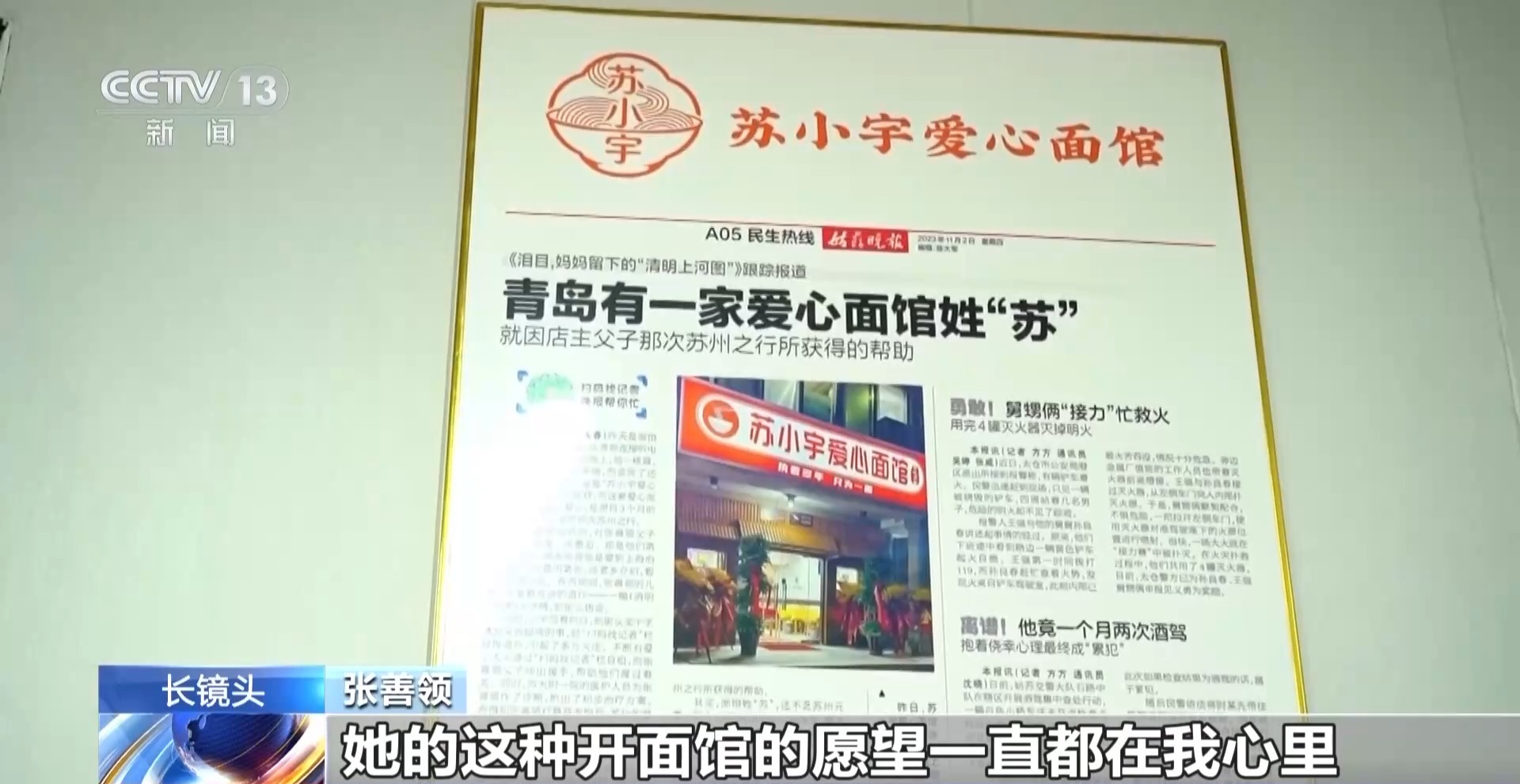 张善领:我是为了感谢苏州市民对我的帮助,所以我就改了“苏小宇爱心面馆”,“苏”代表苏州的意思。