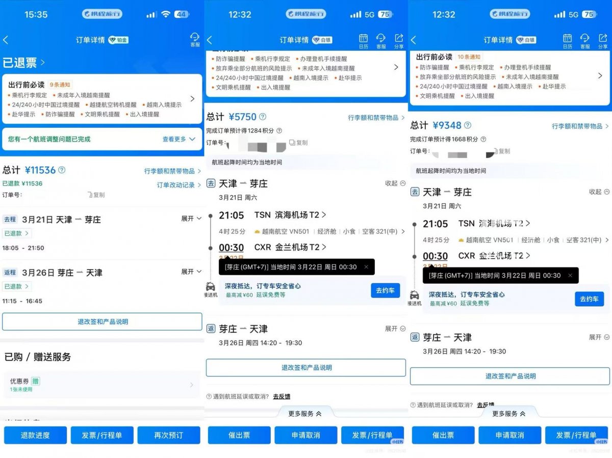 左图为被取消的航班机票全额退票;中图和右图为及女士分两单重新购买的4张机票。(来源:受访者)