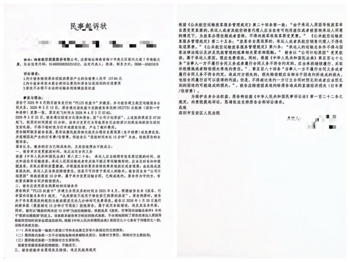 信网·信号新闻4月15日讯 广东的大一学生小胡因为海南航空控股股份有限公司(以下简称“海航”)的飞机提前起飞而“闹心”。他用海航PLUS权益卡兑换了4月3日深圳飞往呼和浩特的机票,由于航班提早10分钟起飞打乱了他的出行计划。他提出改签及报销因此产生的酒店住宿费用,被海航拒绝。小胡认为,海航的“提早起飞不足15分钟不能免费改签”的条款,是他购买海航PLUS权益卡之后出台的,且与《中华人民共和国民法典》等上位法冲突。近日,小胡向信号新闻(0532-80889431)介绍说,他已向法院递交了起诉海航的诉状,等待法院立案。