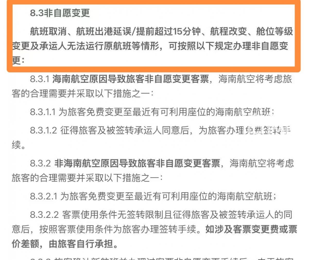 事后,小胡联系了海南航空,要求其承担上述住宿费用,被对方拒绝。海航客服给出的依据是《海南航空控股股份有限公司旅客、行李国内运输总条件》第8.3条,其中规定,航班取消、出港延误/提前超过15分钟,可办理非自愿变更,但小胡乘坐的航班变更时长仅10分钟,所以不符合相应条件,航司也可以据此规定免责。