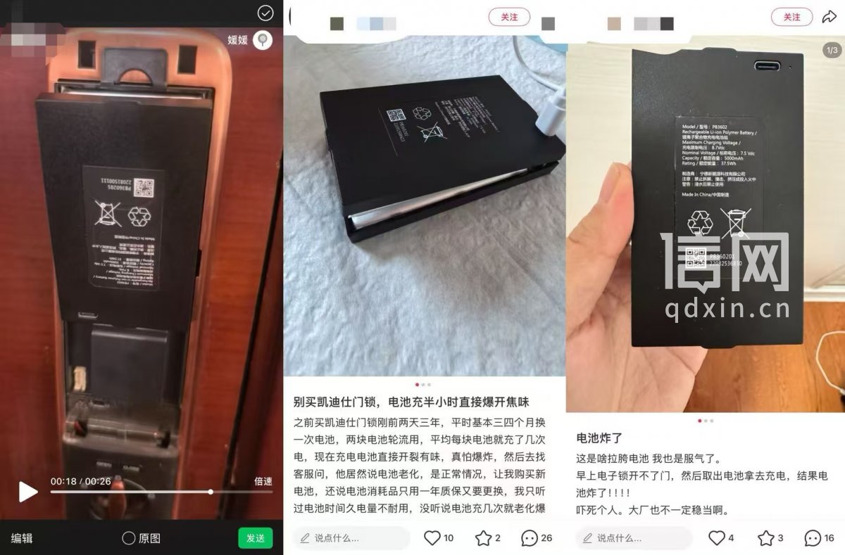 信号新闻检索相关资讯后发现,凯迪仕智能锁电池出现问题并非个例,社交平台上已经出现了多起同姚先生类似的投诉或爆料。4月7日,有江苏网友就在网上反馈称,家中的凯迪仕智能锁电池,一块在充电过程中爆开,另一块在门锁使用中爆开。有广东用户也反映,家里同品牌门锁原装备用电池,充电3至4次后,就出现了鼓包现象,无法继续使用。