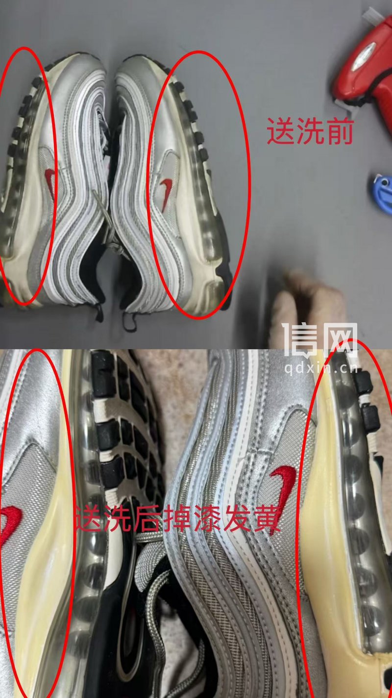 信网4月21日讯 “这双鞋送去洗护的时候还是‘保值尖货’,寄回来的时候都穿不出门。”近日,北京市民李女士向信网(0532-80889431)反映,自己那双Nike Air Max 97 Silver Bullet运动鞋送洗后白漆脱落,露出了底色。对此,洗衣工厂提出了300元赔偿,但李女士不同意,要求按照购买时的原价进行赔付。