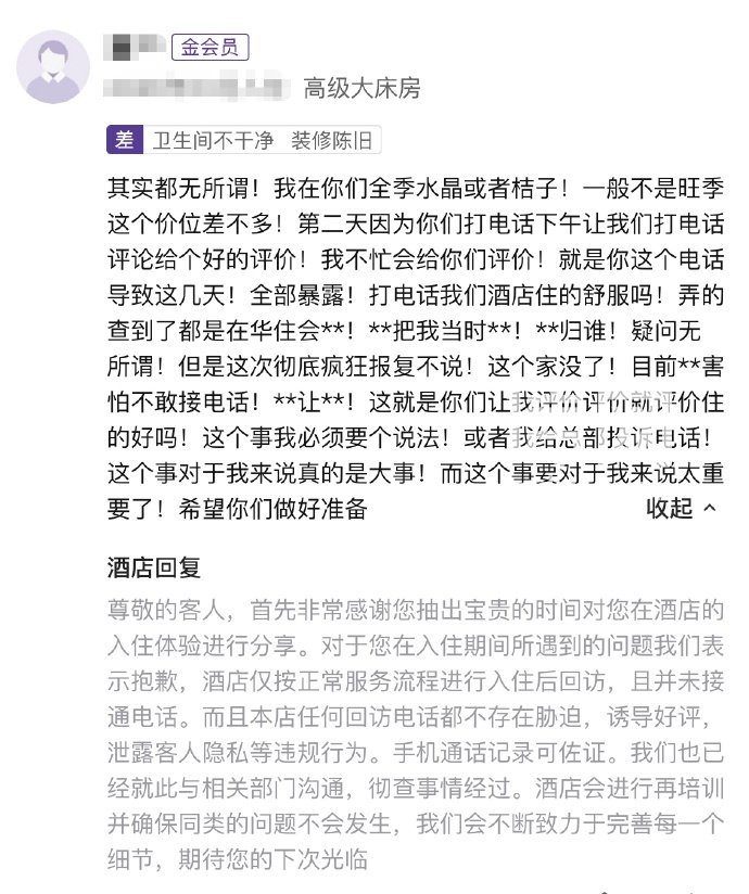 而逼着消费者走到这一步的,是酒店行业那个日益膨胀且冰冷的KPI考核机制。连锁酒店将好评率与门店流量强绑定,加盟商将好评数与前台绩效强挂钩。据报道,不少连锁酒店甚至设置硬性回访指标,未接通的情况下需尝试拨打多次。华住会官方客服嘴上说着“不会规定门店进行回访”,但多位华住旗下酒店员工私下透露的“不打就没绩效”。