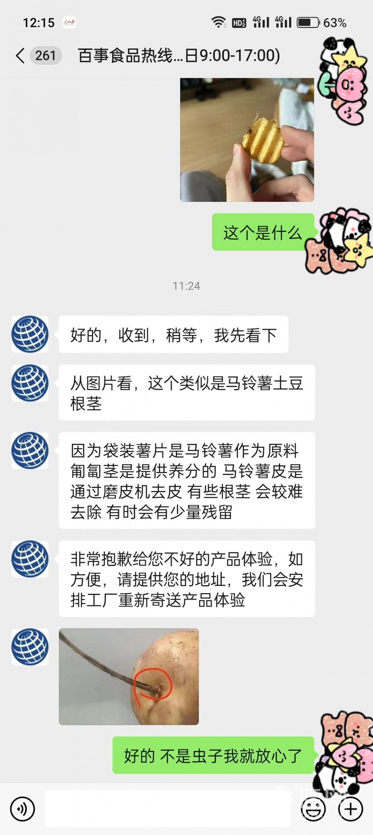 狄先生向信网表示,他经常购买该款薯片,还是第一次遇到这种情况,事发后他拨打了乐事所属的百事食品客服热线。工作人员在知悉情况后,主动添加了狄先生的微信。经过图片对比分析,客服人员判断,这些根状物其实是马铃薯的匍匐茎,工厂磨皮机在给马铃薯去皮时,部分根茎会比较难去除,有时会有少量残留,为正常现象。介于该问题给狄先生带来了不佳的产品体验,公司决定安排工厂为他重新寄送一包薯片。
