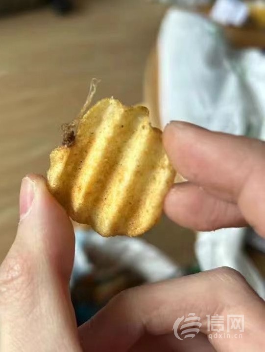 近日,市民狄先生在个人社交平台发文投诉称,其在青岛市市南区某便利店内购买了一包40克装的乐事香脆烤鸡翅味大波浪薯片,花费4.5元,食用过程中,他在薯片内部发现了嵌入薯片内的不明条状物。“很像炸至金黄的蚂蚱腿,我可不敢随便吃。”