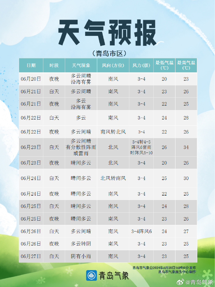 【青岛市区】今天夜间,多云间晴,沿海有雾,南风3到4级,明天白天,多云间晴,南风3到4级,相对湿度70%-95%,明天最低气温20℃,最高气温26℃,21日夜间到22日白天:多云,沿海有雾,南风3到4级,22到28℃,22日夜间到23日白天:多云间晴有分散性阵雨或雷雨,南风3到4级转北风4到5级阵风6级雷雨时阵风8到10级,22到34℃。