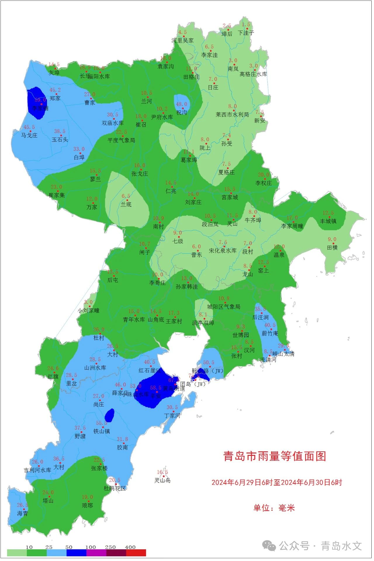 信网6月30日讯 据青岛市水文局最新发布的统计数据显示,6月29日6时至30日6时,全市平均降水量18.3mm,最大点市区团岛75.5mm。